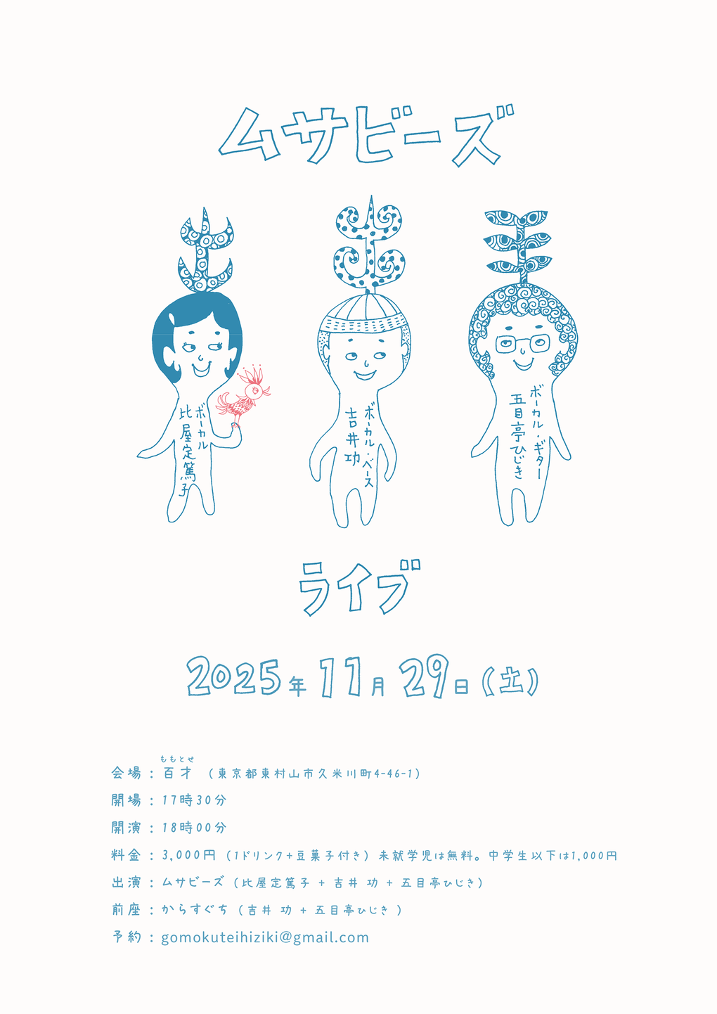 ムサビーズ(比屋定篤子 + 吉井 功 + 五目亭ひじき)、LIVE決定!