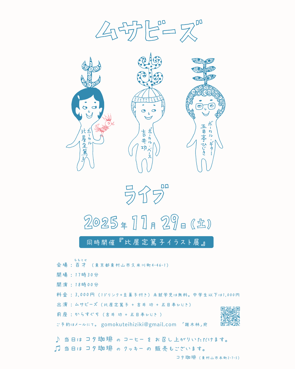 比屋定篤子イラスト展 ムサビーズのLIVEと同時開催決定! コタ珈琲さんも出店!