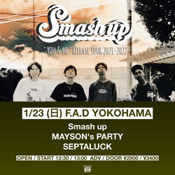Smash up "You & Me" release tour 2021-2022 1/23 (日) F.A.D YOKOHAMA Smash up MAYSONS PARTY SEPTALUCK OPEN / START 12:30 / 13:00 ADV / DOOR ¥2900 / ¥3400 チケットweb予約受付開始!