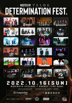 VELDE presents 「DETERMINATION FEST」 ▼日程 2022年10月16日(日) ▼会場 渋谷CYCLONE / 渋谷GARRET / 渋谷THE GAME ▼時間 OPEN/START 13:00/14:00 ▼料金 前売 ¥3,500 詳細はLIVEでご確認下さい。