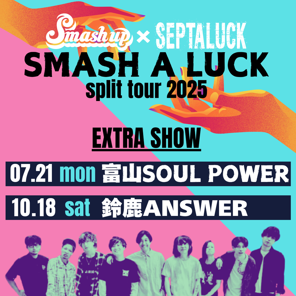 大好評で幕を閉じたSMASH A LUCK split tour 2025の熱量をそのまま継続すべくEXTRA SHOWが2本開催決定しました!! 7/21 富山SOUL POWER 10/18 鈴鹿ANSWER 対バンや詳細は追って解禁して行くので引き続き情報をチェックしてください! チケット予約は受付開始!