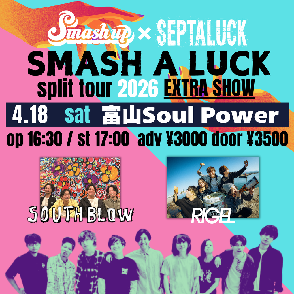 12月いっぱいで活動休止となったSEPTALUCKですが、昨年中にメンバーの体調不良により延期となっていたSMASH A LUCK split TOUR富山SOUL POWER編の振替公演の開催が決まりました! 2026年4月18日(土)富山SOUL POWER 詳細やチケット情報はLIVEページにて!